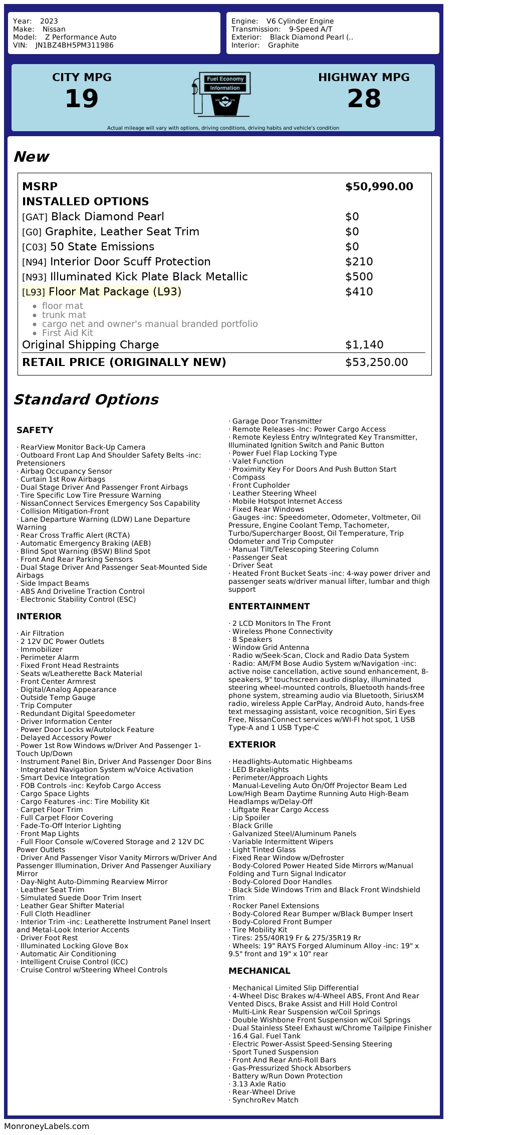 Get ready to turn heads in this sleek and powerful Black 2023 Nissan Z! This used car is built to impress with a 3.0L Twin Turbo V6 engine under the hood, paired with a 9-speed automatic transmission that features paddle shifters and launch control for an exhilarating driving experience. The rear-wheel drive and sport-tuned suspension make every ride feel like a thrilling adventure.